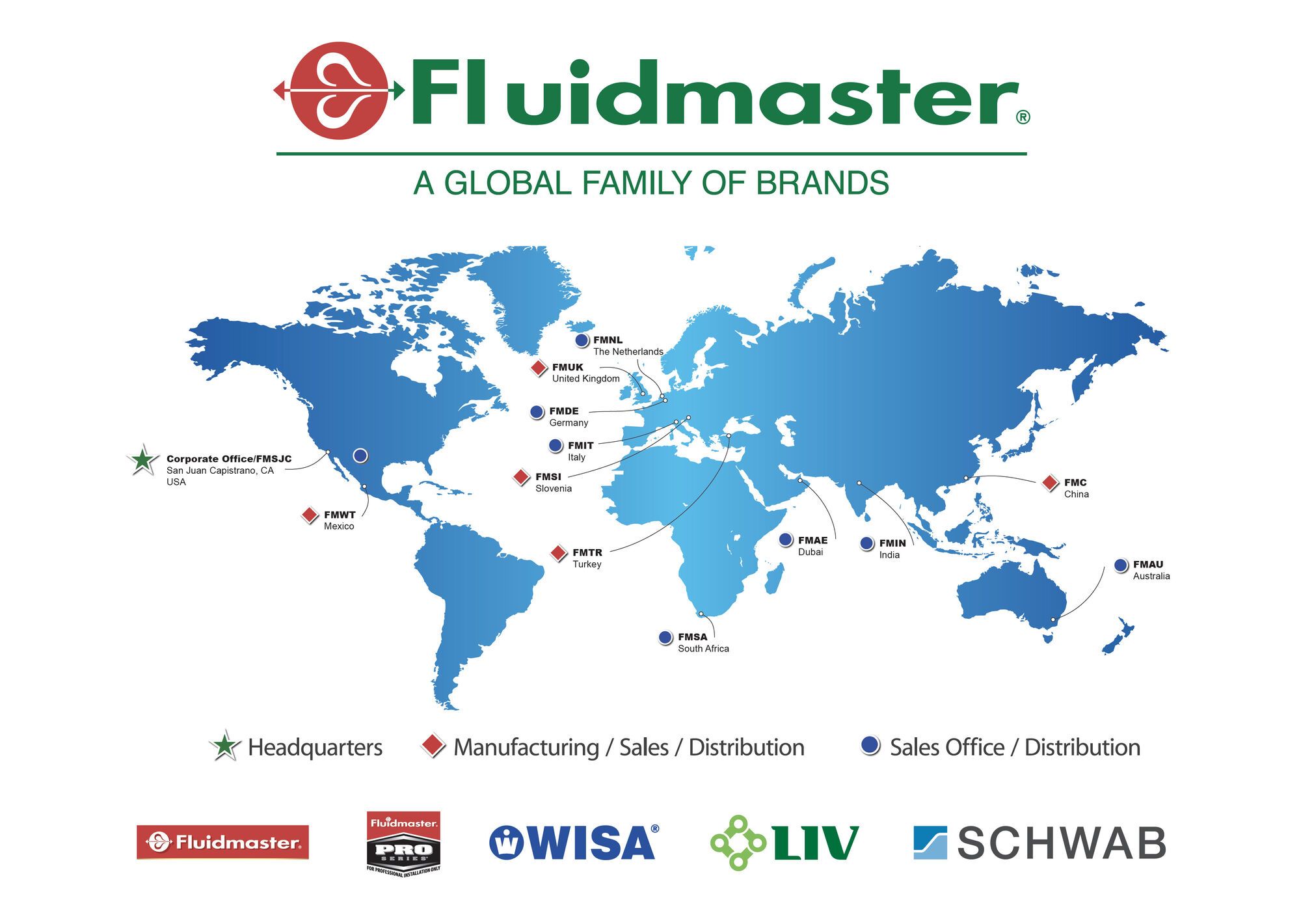 Fluidmaster jest firmą rodzinną z siedzibą w San Juan Capistrano w Stanach Zjednoczonych posiadającą kilka zakładów produkcyjnych na całym świecie – w Meksyku, Chinach, Wielkiej Brytanii, Turcji, Holandii, Słowenii i Indiach.